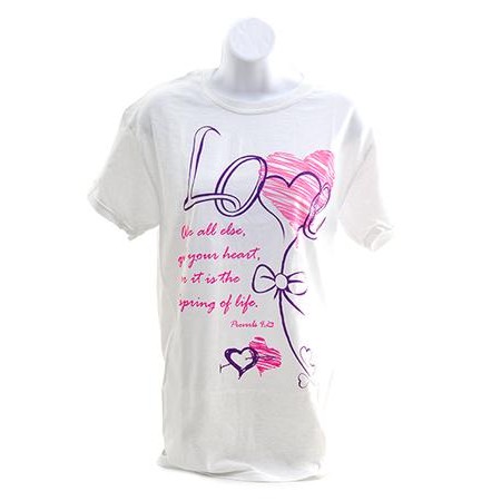Share you love for the Lord with this white, short sleeve witness tee! Dainty hearts and bows in deep violet and magenta with Scripture from Proverbs: 4:23, Love. Above all else, guard your heart, for it is the wellspring of life. Tag-free design; machine washable; 100% preshrunk cotton.