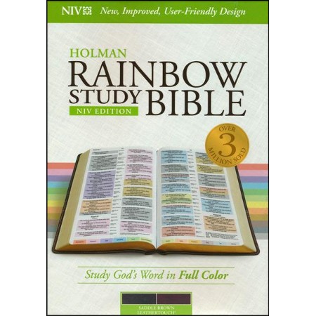 The Holman Rainbow Study Bible has a unique color-coding system that allows you to identify quickly and easily twelve major themes of Scripture throughout the text: God, discipleship, love, faith, sin, evil, salvation, family, outreach, commandments, history, and prophecy. The system also underlines all words directly spoken by the Father, Jesus, and the Holy Spirit.