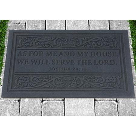 Inspirational doormat for the Christian home displays the best-loved Scripture quote from Joshua 24:15, with decorative scroll trim and non-skid rubber backing. As for me and my house we will serve the Lord on polyester black felt mat; 27.5″ x 17.5″; may be spot cleaned. Upscale design for today’s Christian decor, suitable for indoor and outdoor use.