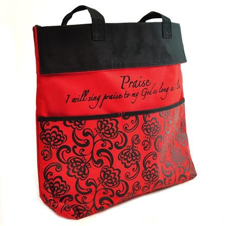 Stylish canvas tote is roomy and modern, featuring deep outside zip pocket, two front pockets, and embroidered Scripture quote from Psalm 104:33 I will sing praise to my God as long as I live. In bold red and black color combo with foldover top, matching canvas handles, and new fashion print. 14.5″ x 14″ x 3.5″ with generous 10″ straps. Ideal for shopping, gym, pool, beach, travel, or work.
