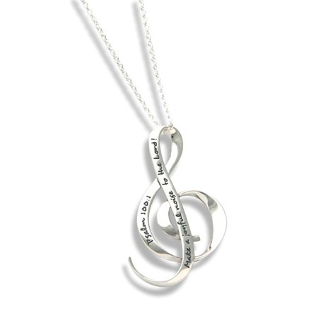 Sterling silver G-clef necklace is perfect for the music lover. Encraved with Scripture “Make a joyful noise to the Lord!” Psalm 100:1, 1.5″ pendant hangs on a 18″ sterling silver chain. Gift boxed.