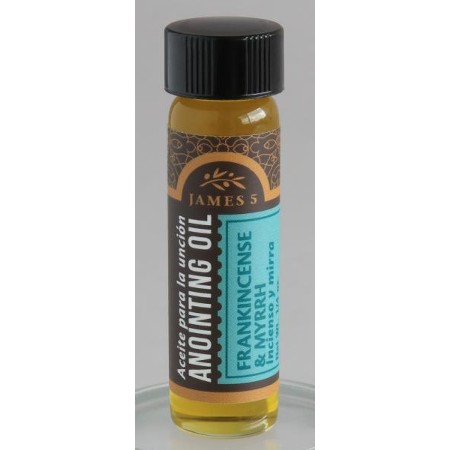 Broadman Frankincense & Myrrh Anointing Oil in portable 1/4 ounce bottle with lovely design featuring James 5 at the top.